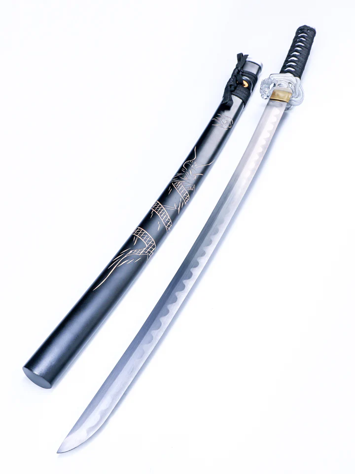 Crafted for collectors and traditional art enthusiasts, the Black Dragon katana pairs a polished, unsharpened carbon‑steel blade with a deep obsidian saya. A single dragon is hand‑etched into the lacquered scabbard, its scales and whiskers rendered in fine detail. The sword arrives with a minimalist wooden stand so it can be displayed horizontally, blade up, as etiquette recommends, straight out of the box.