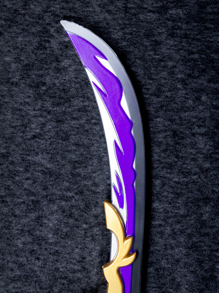 Summon a storm without risking the crowd. Our Engulfing Lightning polearm uses durable fiberglass for stability, covered in polyurethane foam and finished with electro‑charged violets and crackling energy veins. The tapered spearhead and ornate crescent guard mirrors Raiden Shogun’s iconic weapon while remaining lightweight and convention‑safe. Perfect for fans and collectors alike.